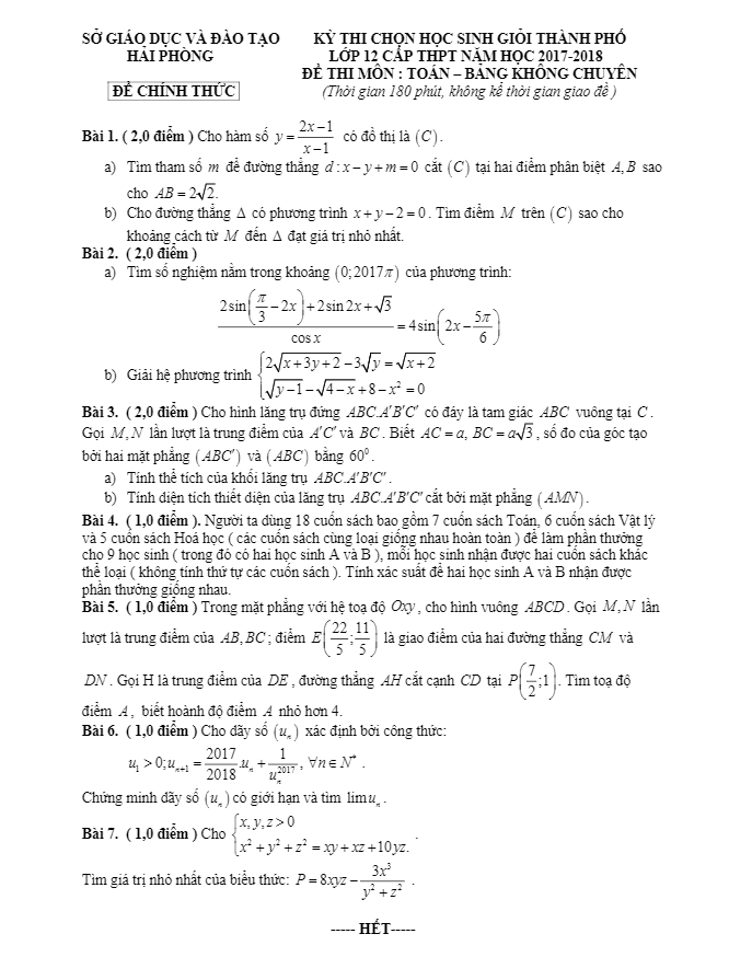 Đề thi chọn HSG thành phố Toán lớp 12 năm học 2017 – 2018 sở GD và ĐT Hải Phòng (Bảng không chuyên) bao gồm 7 bài toán tự luận, thời gian làm bài 180 phút.
