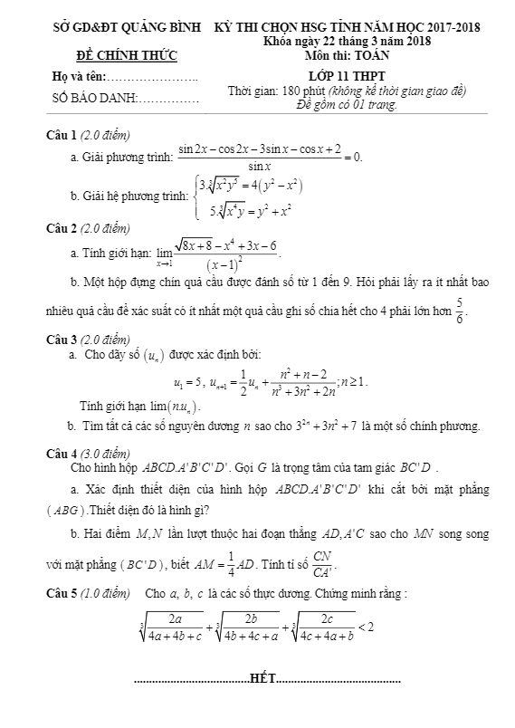 Ngày 22 tháng 03 năm 2018, sở Giáo dục và Đào tạo tỉnh Quảng Bình đã tổ chức kỳ thi chọn học sinh giỏi tỉnh môn Toán lớp 11 THPT năm học 2017 – 2018. Đề thi chọn HSG tỉnh Toán lớp 11 năm 2017 – 2018 sở GD&ĐT Quảng Bình bao gồm 01 trang với 05 bài toán, thời gian làm bài 180 phút, đề thi có hướng dẫn chấm.