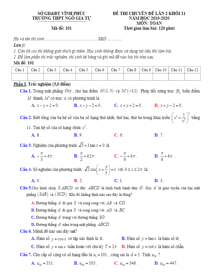 Đề thi chuyên đề Toán lớp 11 lần 2 năm 2019 – 2020 trường Ngô Gia Tự – Vĩnh Phúc