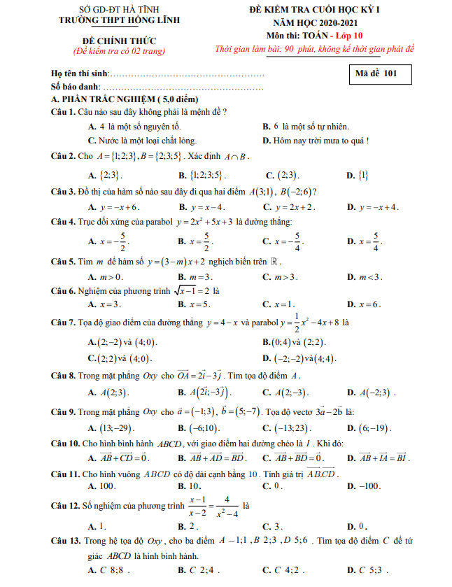 Đề thi cuối học kì 1 (HK1) lớp 10 môn Toán năm 2020 2021 trường THPT Hồng Lĩnh Hà Tĩnh