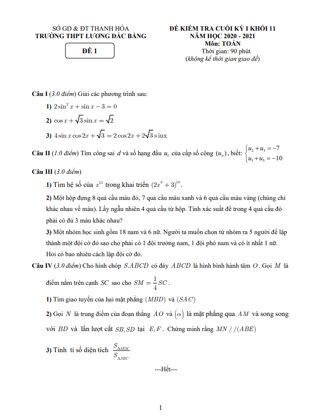 Đề thi cuối học kỳ 1 Toán lớp 11 năm 2020 – 2021 trường Lương Đắc Bằng Thanh Hóa