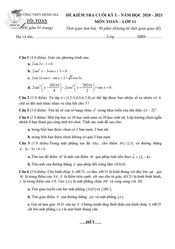 Đề thi cuối học kì 1 (HK1) lớp 11 môn Toán năm 2020 2021 trường THPT Đông Hà Quảng Trị