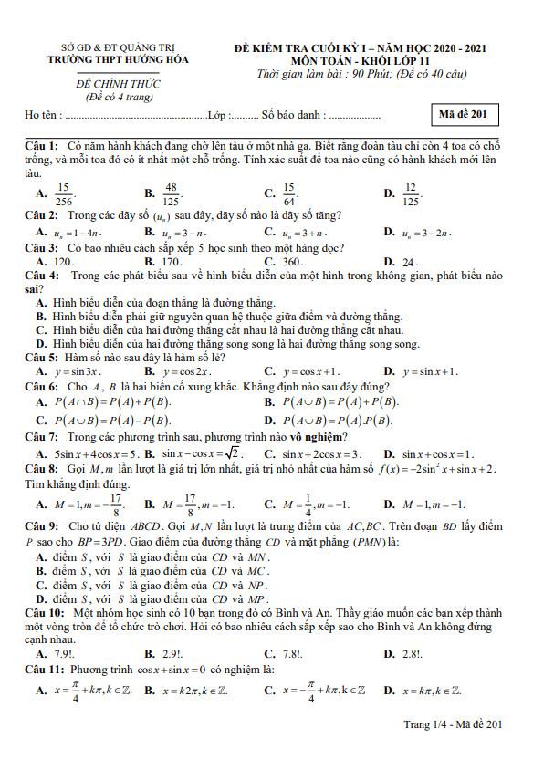 Đề thi cuối kỳ 1 môn Toán lớp 11 năm học 2020 – 2021 tại trường THPT Hướng Hóa – Quảng Trị đã được biên soạn theo hình thức trắc nghiệm, với tổng cộng 40 câu hỏi và bài toán trải dài trên 04 trang giấy. Thời gian làm bài thi được giao là 90 phút.