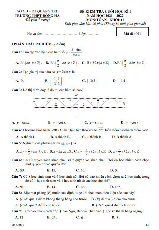 Đề thi cuối học kì 1 Toán lớp 11 năm 2021 – 2022 trường THPT Đông Hà – Quảng Trị