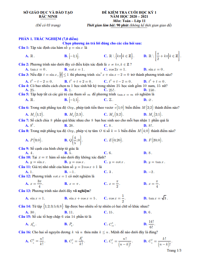Đề thi cuối học kì 1 môn Toán lớp 11 năm học 2020 – 2021 sở GD&ĐT Bắc Ninh đưa ra các bài tập và câu hỏi phong phú, đa dạng để kiểm tra kiến thức và kỹ năng của học sinh. Hãy cùng học sinh tham gia và chinh phục thử thách của đề thi này!