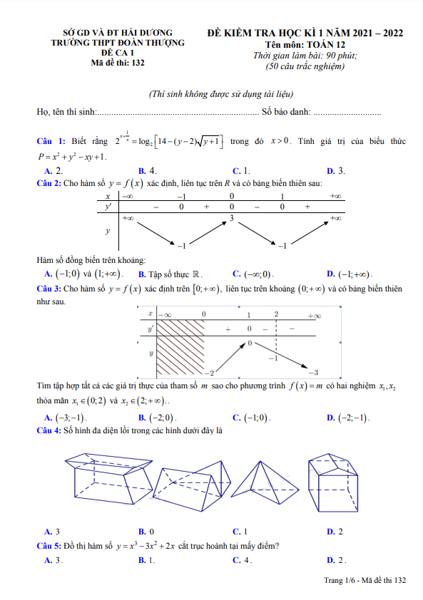 Đề thi cuối học kì 1 Toán lớp 12 năm 2021 – 2022 trường THPT Đoàn Thượng – Hải Dương