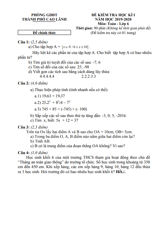 Đề thi cuối học kì 1 (HK1) lớp 6 môn Toán năm 2019 2020 phòng GD ĐT TP Cao Lãnh Đồng Tháp