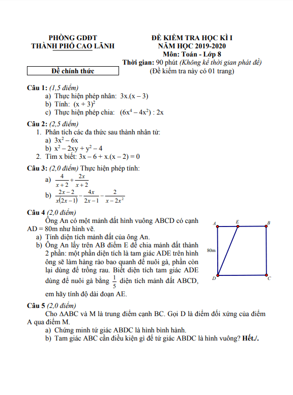 Trích dẫn đề thi cuối kì 1 Toán lớp 8 năm 2019 – 2020 phòng GD&ĐT thành phố Cao Lãnh – Đồng Tháp: