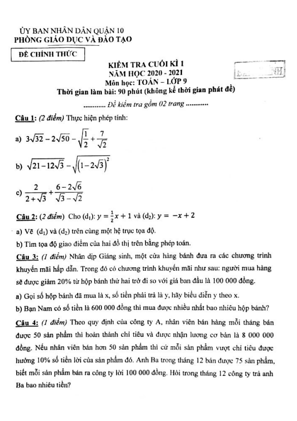 Đề thi cuối học kì 1 (HK1) lớp 9 môn Toán năm 2020-2021 phòng GD ĐT Quận 10 TP HCM