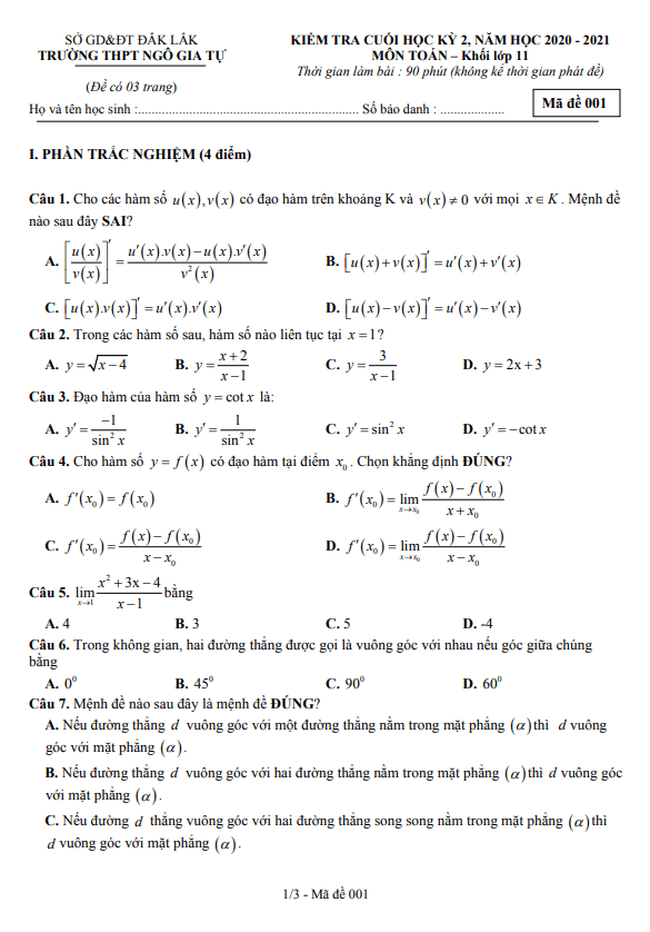Sytu xin gửi đến quý thầy cô và các em học sinh lớp 11 đề thi cuối học kỳ 2 môn Toán năm học 2020 – 2021 của trường THPT Ngô Gia Tự – Đắk Lắk. Đề thi bao gồm các mã đề 001, 002, 003, 004, 005, 006, 007, 008 với đáp án trắc nghiệm và lời giải chi tiết cho các câu hỏi tự luận.