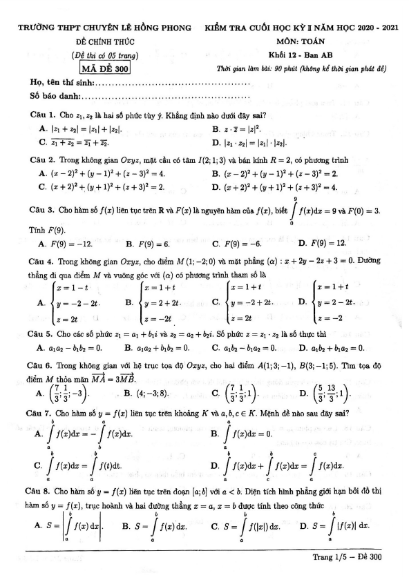 Đề thi cuối học kì 2 môn Toán lớp 12 năm học 2020 – 2021 tại trường THPT chuyên Lê Hồng Phong ở quận 5, thành phố Hồ Chí Minh có mã đề 300. Đề bài bao gồm 50 câu trắc nghiệm trải dài trên 5 trang giấy, thời gian làm bài 90 phút.