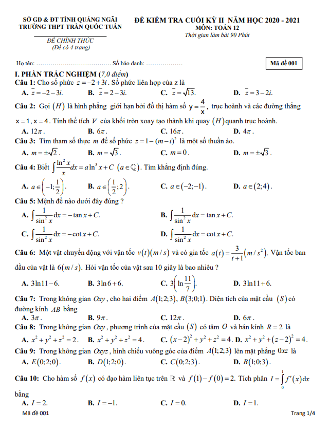 Đề thi cuối kỳ 2 môn Toán lớp 12 năm 2020 – 2021 trường Trần Quốc Tuấn Quảng Ngãi mã đề 001 có cấu trúc gồm phần trắc nghiệm và phần tự luận. Phần trắc nghiệm bao gồm 35 câu, chiếm 07 điểm; phần tự luận gồm 04 câu, chiếm 03 điểm. Thời gian làm bài được thiết lập là 90 phút. Đề thi được cung cấp kèm đáp án và lời giải chi tiết cho các mã đề từ 001 đến 008.