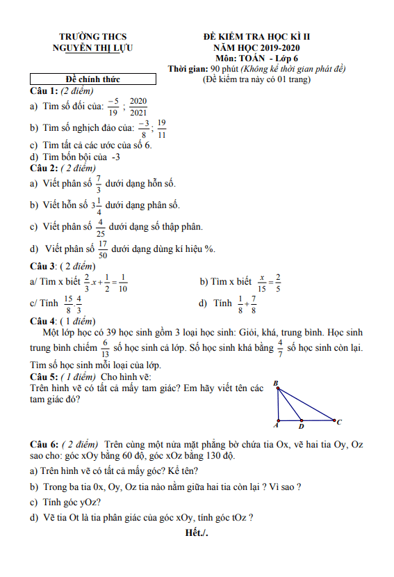 Bài toán đầu tiên trong đề thi cuối kỳ Toán lớp 6 năm học 2019-2020 của trường THCS Nguyễn Thị Lựu là bài toán về phân loại học sinh trong một lớp học. Đề bài cho biết rằng lớp học có tổng cộng 39 học sinh, trong đó có 3 loại học sinh: Giỏi, khá, trung bình. Biết rằng số học sinh trung bình chiếm 2/6 tổng số học sinh, số học sinh khá bằng 7/4 số học sinh còn lại. Hỏi số học sinh mỗi loại trong lớp học đó là bao nhiêu?Bài toán thứ hai yêu cầu học sinh phải đếm và viết tên các tam giác trên hình vẽ đã cho. Học sinh cần phải quan sát kỹ để nhận biết và đưa ra câu trả lời chính xác.Bài toán cuối cùng đưa ra các yêu cầu về góc và tia trong một hình vẽ. Học sinh cần phải tính toán, phân tích để tìm ra góc yOz và góc tOz, cũng như phải lập luận và giải thích về vị trí của các tia Ox, Oy, Oz trên hình vẽ.Đề thi cuối kỳ Toán lớp 6 năm học 2019-2020 của trường THCS Nguyễn Thị Lựu Đồng Tháp không chỉ là bài kiểm tra kiến thức mà còn là cơ hội cho học sinh thể hiện khả năng phân tích, giải quyết vấn đề và sự sáng tạo trong suy nghĩ. Để đạt được điểm cao, học sinh cần phải luyện tập, ôn tập và hiểu rõ từng bước giải của các bài toán. Chúc các em học sinh lớp 6 thành công trong kỳ thi cuối kỳ và có kỳ nghỉ hè vui vẻ và ý nghĩa.