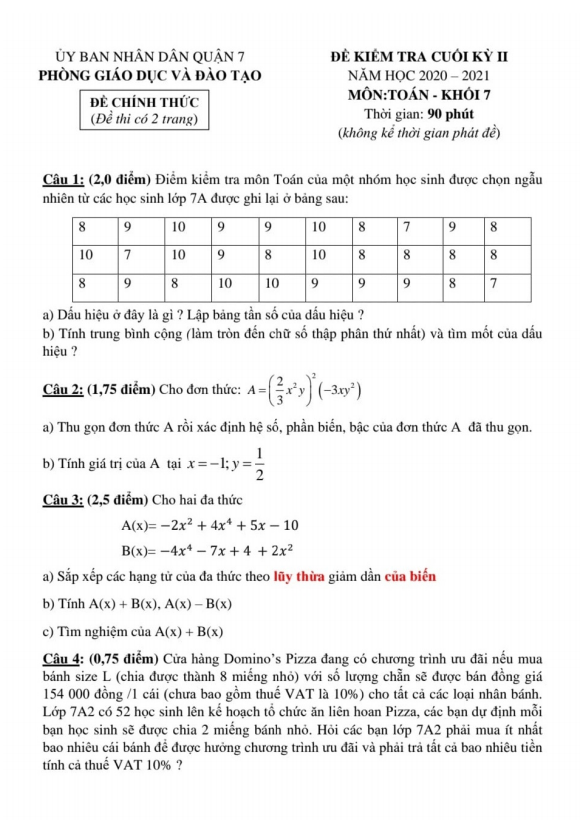Đề thi cuối kỳ 2 môn Toán lớp 7 năm học 2020-2021 của phòng GD&ĐT quận 7 TP HCM bao gồm 2 trang với 6 bài toán dạng tự luận, thời gian làm bài 90 phút.