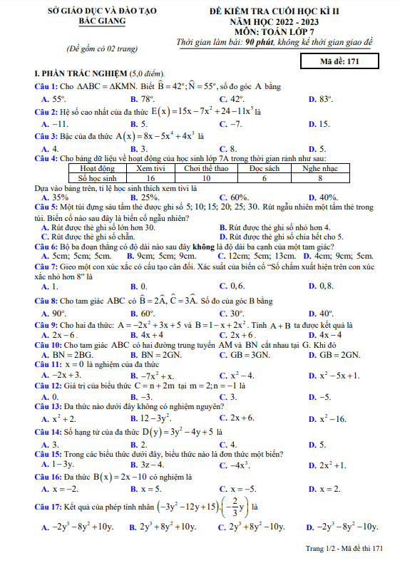 Sytu xin gửi đến quý thầy cô và các em học sinh lớp 7 đề thi cuối học kì 2 môn Toán năm học 2022-2023 của sở Giáo dục và Đào tạo tỉnh Bắc Giang. Đề thi bao gồm 50% câu hỏi trắc nghiệm và 50% câu hỏi tự luận, thời gian làm bài là 90 phút, không tính thời gian giao đề. Đề thi đi kèm đáp án, lời giải chi tiết và hướng dẫn chấm điểm.Một trong những câu hỏi trong đề thi là: “Một túi đựng sáu tấm thẻ được ghi số 5; 10; 15; 20; 25; 30. Rút ngẫu nhiên một tấm thẻ trong túi. Biến cố nào sau đây là biến cố ngẫu nhiên? A. Rút được thẻ ghi số lớn hơn 30. B. Rút được thẻ ghi số nhỏ hơn 4. C. Rút được thẻ ghi số chẵn. D. Rút được thẻ ghi số chia hết cho 5.”Ngoài ra, đề thi cũng yêu cầu học sinh giải quyết bài toán về tỉ lệ khối lượng các loại quả bán được trong ngày Chủ nhật của một cửa hàng, và chứng minh một khẳng định về hình tam giác. Đề thi cuối học kì 2 môn Toán lớp 7 năm học 2022-2023 sở GD&ĐT Bắc Giang là cơ hội để học sinh thử sức và cải thiện kiến thức Toán của mình. Chúc quý thầy cô và các em học sinh có kỳ thi thành công!