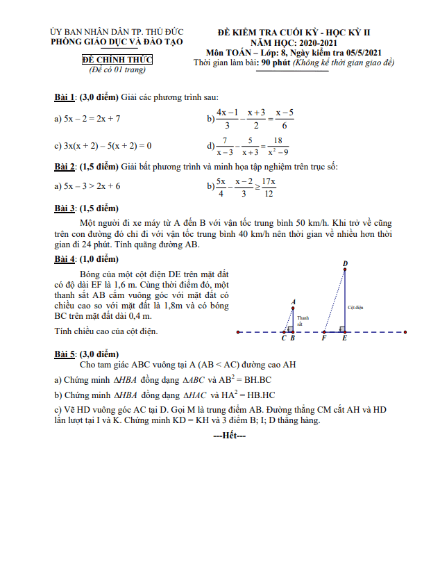 Vào Thứ Tư, ngày 05 tháng 05 năm 2021, Phòng Giáo dục và Đào tạo Thủ Đức, thành phố Hồ Chí Minh đã tổ chức kỳ thi kiểm tra chất lượng môn Toán cho lớp 8 giai đoạn cuối học kỳ 2 năm học 2020-2021. Đề thi được biên soạn dưới hình thức đề thi tự luận, bao gồm 01 trang với 05 bài toán. Thí sinh có thời gian làm bài trong vòng 90 phút. Đề thi được cung cấp kèm đáp án, lời giải chi tiết và hướng dẫn chấm điểm.