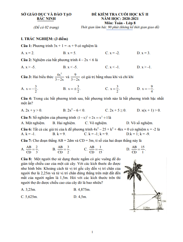 Trích dẫn đề thi cuối học kỳ 2 Toán lớp 8 năm 2020-2021 sở GD&ĐT Bắc Ninh: