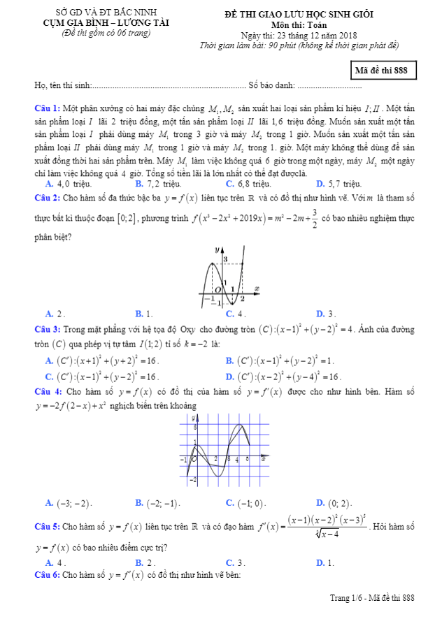 Đề thi giao lưu HSG Toán năm 2018 – 2019 cụm Gia Bình – Lương Tài – Bắc Ninh có mã đề 888 là bài kiểm tra đánh giá chất lượng đội tuyển học sinh giỏi Toán của các trường. Đề thi bao gồm 6 trang, với tổng cộng 50 câu hỏi và bài toán được đưa ra dưới dạng trắc nghiệm khách quan. Thời gian làm bài là 90 phút, kỳ thi diễn ra vào ngày 23 tháng 12 năm 2018. Một số câu hỏi và bài toán trong đề thi giao lưu bao gồm:- Vấn đề về phân xưởng sản xuất sản phẩm loại I và II với sự sử dụng hai máy đặc chủng M1, M2 và việc tối ưu hoá lãi.- Vấn đề về việc tính toán số ngày ít nhất để hai tài xế taxi chạy hết lượng xăng được cấp khoán cho mỗi người.- Bài toán về việc tạo hình trụ từ khối gỗ hình hộp chữ nhật, với yêu cầu về vẽ đường tròn nội tiếp hai hình vuông và phải tính toán số tiền cần để sản xuất 10 đồ vật như vậy.Đề thi giao lưu HSG Toán năm 2018 – 2019 cụm Gia Bình – Lương Tài – Bắc Ninh không chỉ giúp học sinh rèn luyện và phát triển năng lực môn Toán mà còn tạo điều kiện cho họ thể hiện khả năng sáng tạo, tư duy logic và giải quyết vấn đề.Bạn có thể tải file WORD (dành cho quý thầy, cô) để biết thêm chi tiết về đề thi và câu hỏi.