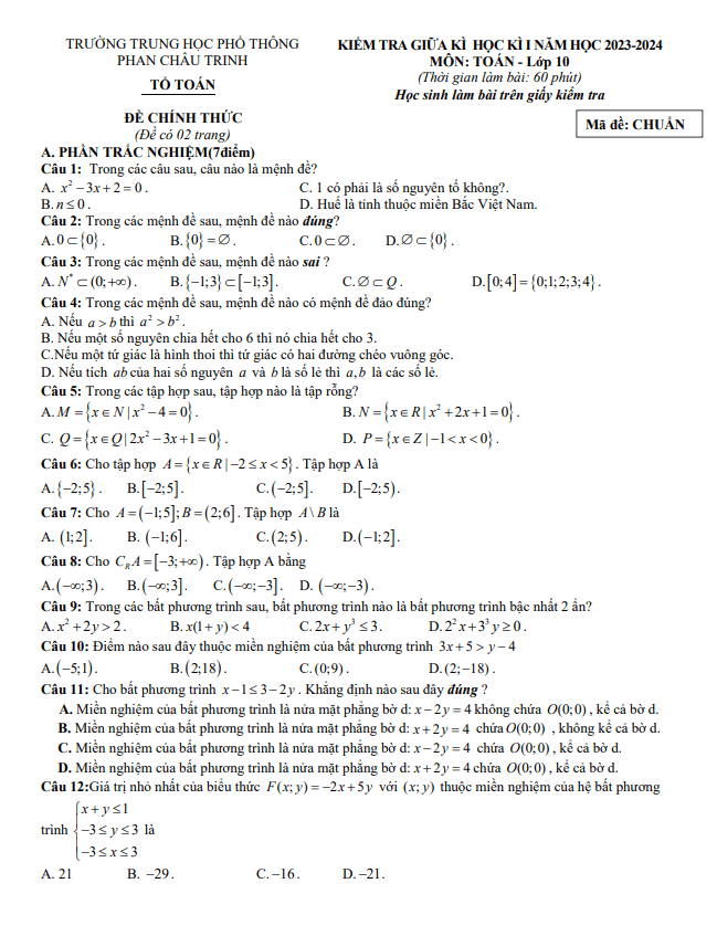 Với bài thi này, học sinh sẽ có cơ hội thử thách kiến thức và kỹ năng Toán của mình, từ đó củng cố và phát triển khả năng tư duy logic và xử lý vấn đề. Chúc các em học sinh lớp 10 trường Phan Châu Trinh Đà Nẵng thành công trong bài thi giữa học kì 1 này!
