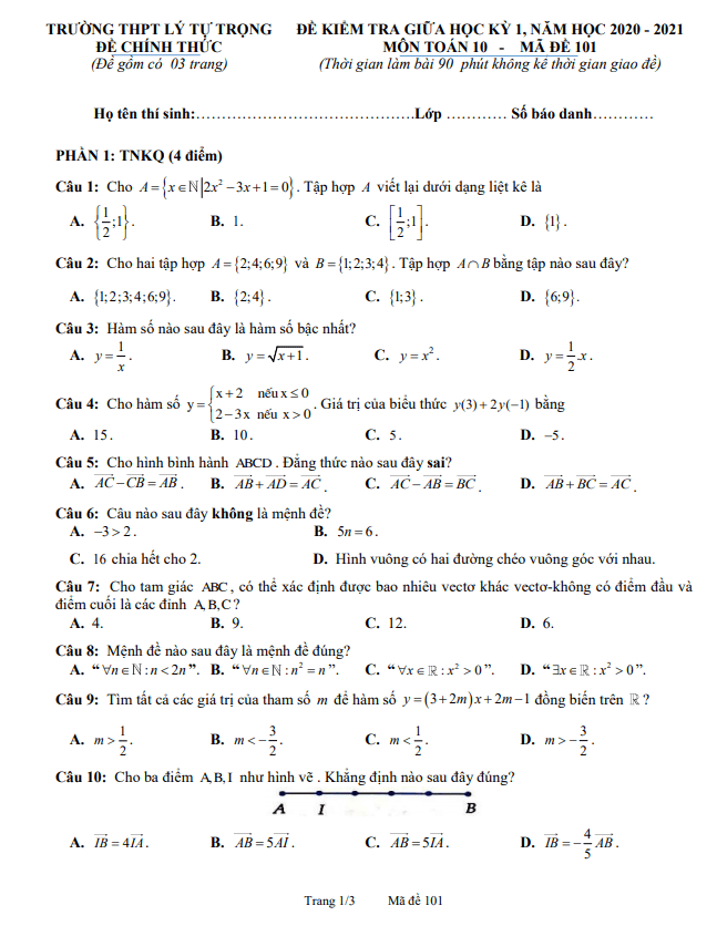 Đề thi giữa học kì 1 (HK1) lớp 10 môn Toán năm 2020 2021 trường THPT Lý Tự Trọng Hà Tĩnh