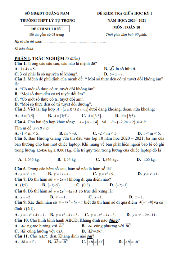 Đề thi giữa học kỳ 1 (HK1) lớp 10 môn Toán năm 2020 – 2021 trường THPT Lý Tự Trọng Quảng Nam