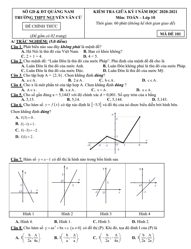 Đề thi giữa học kì 1 (HK1) lớp 10 môn Toán năm 2020 – 2021 trường THPT Nguyễn Văn Cừ – Quảng Nam