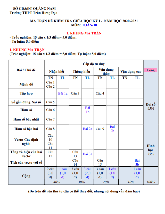 Đề thi giữa học kì 1 (HK1) lớp 10 môn Toán năm 2020 2021 trường THPT Trần Hưng Đạo Quảng Nam