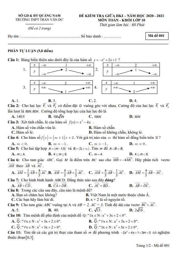 Đề thi giữa học kỳ 1 (HK1) môn Toán lớp 10 năm 2020 – 2021 tại trường THPT Trần Văn Dư Quảng Nam đã được Sytu giới thiệu đến quý thầy, cô giáo và các em học sinh khối 10. Đề thi này được biên soạn theo dạng trắc nghiệm khách quan kết hợp với tự luận, với phần trắc nghiệm gồm 15 câu, chiếm 5 điểm và phần tự luận gồm 3 câu, chiếm 5 điểm. Thời gian làm bài kiểm tra là 60 phút. Đề thi cung cấp đáp án và lời giải chi tiết.Một trong những câu hỏi trong đề thi là bài toán về tam giác nội tiếp đường tròn và việc chứng minh 3 điểm O, H, L thẳng hàng. Câu hỏi tiếp theo liên quan đến định lý về vectơ, yêu cầu phân biệt đúng sai giữa các câu phát biểu. Cuối cùng, câu hỏi về mệnh đề giúp học sinh rèn luyện khả năng phân loại câu đúng và sai.Những bài tập này giúp học sinh thực hành các kiến thức về hình học và định lý toán học cũng như nâng cao kỹ năng giải quyết vấn đề và tư duy logic. Hy vọng đề thi sẽ giúp các em học sinh ôn tập và chuẩn bị tốt cho kỳ thi sắp tới.