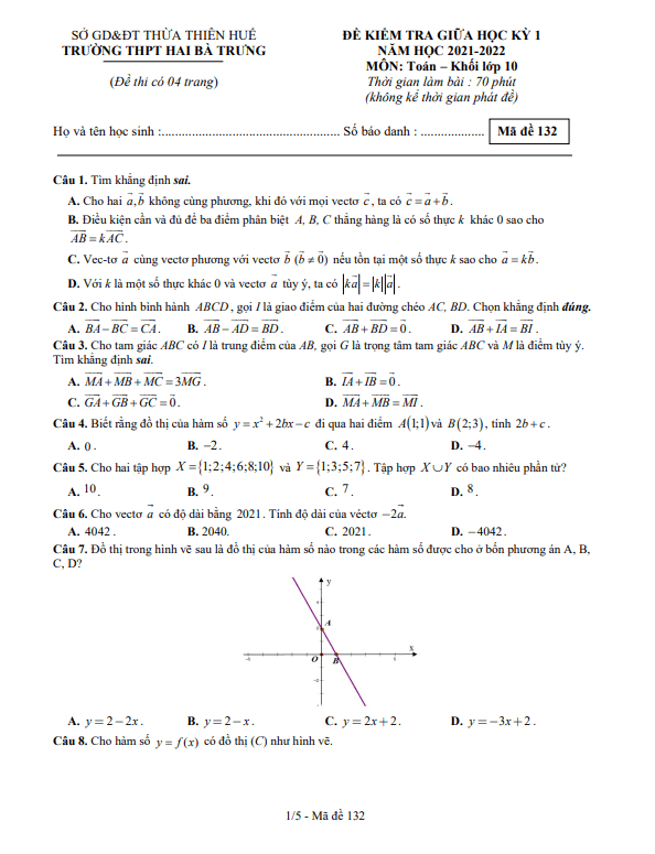 Đề thi giữa học kì 1 (HK1) lớp 10 môn Toán năm 2021 2022 trường THPT Hai Bà Trưng TT Huế