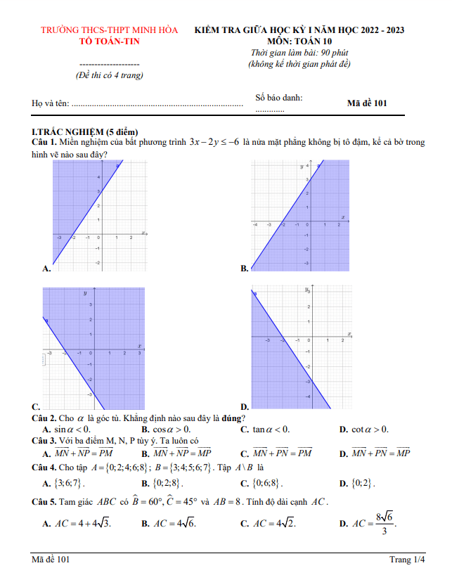 Sytu xin trân trọng giới thiệu đến quý thầy cô và các em học sinh lớp 10 đề kiểm tra chất lượng giữa học kỳ 1 môn Toán năm học 2022 – 2023 của trường THCS & THPT Minh Hòa, tỉnh Bình Dương. Đề thi có mã đề là 101, được biên soạn theo cấu trúc 50% câu hỏi trắc nghiệm và 50% câu hỏi tự luận. Thời gian làm bài là 90 phút (không tính thời gian phát đề). Đề thi này được thiết kế phù hợp với chương trình học hiện tại.