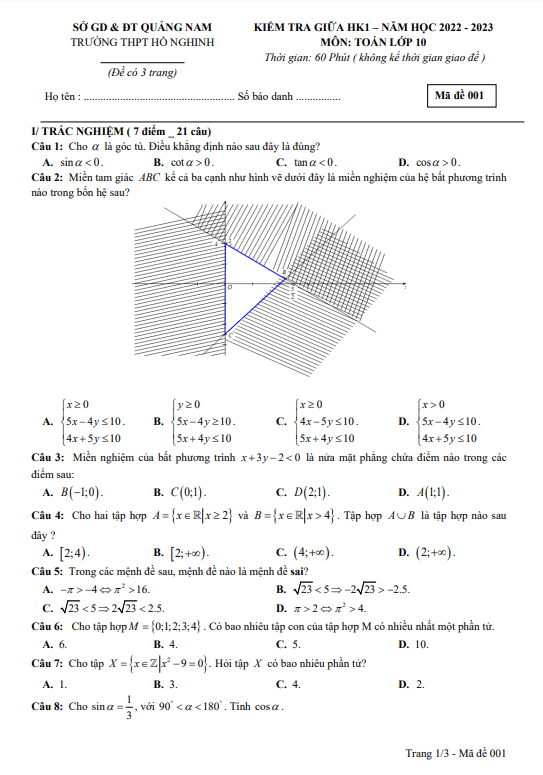 Đề thi giữa học kì 1 (HK1) lớp 10 môn Toán năm 2022-2023 trường THPT Hồ Nghinh, Quảng NamSytu xin gửi đến quý thầy cô và các em học sinh lớp 10 đề kiểm tra đánh giá giữa học kì 1 môn Toán năm học 2022-2023 trường THPT Hồ Nghinh, tỉnh Quảng Nam. Đề thi được cấu trúc như sau: 70% trắc nghiệm + 30% tự luận, gồm 21 câu trắc nghiệm và 3 câu tự luận. Thời gian làm bài là 60 phút (không tính thời gian phát đề). Đề thi có đáp án mã đề từ 001 đến 008.Một số câu hỏi đáng chú ý trong đề thi:1. Miền tam giác ABC kể cả ba cạnh như hình vẽ dưới đây là miền nghiệm của hệ bất phương trình nào trong bốn hệ sau?2. Trong các câu sau, câu nào là mệnh đề? A. Việt Nam là nước đông dân nhất thế giới. B. Bạn học trường nào? C. Không được làm việc riêng trong giờ học. D. Hãy học bài đi!3. Người ta dự định sử dụng mía và củ cải đường để chiết xuất đường. Tính toán số nguyên liệu cần dùng để chi phí mua nguyên liệu là ít nhất, biết rằng cung cấp không quá 10 tấn mía và 9 tấn củ cải đường.File Word đề thi đã được chuẩn bị sẵn để quý thầy cô tải về và sử dụng.Mong rằng đề thi sẽ giúp các em học sinh ôn tập và củng cố kiến thức hiệu quả. Chúc các em thành công!