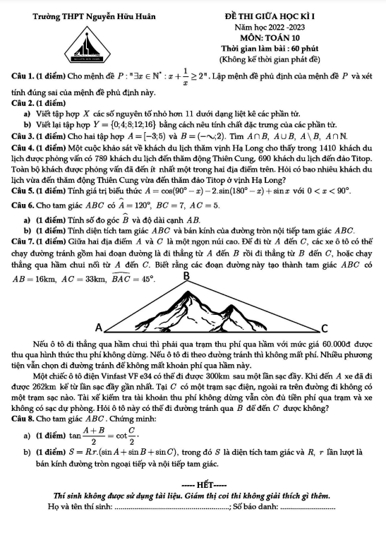 Đề thi giữa học kì 1 (HK1) lớp 10 môn Toán năm 2022 2023 trường THPT Nguyễn Hữu Huân TP HCM