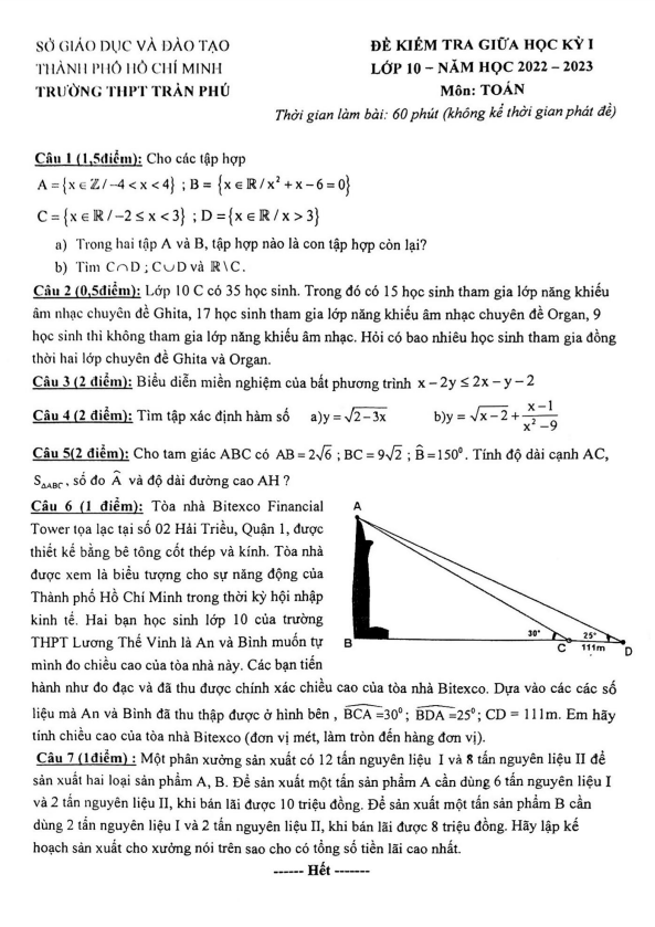 Đề kiểm tra giữa học kỳ 1 Toán lớp 10 năm 2022 – 2023 trường THPT Trần Phú TP HCM