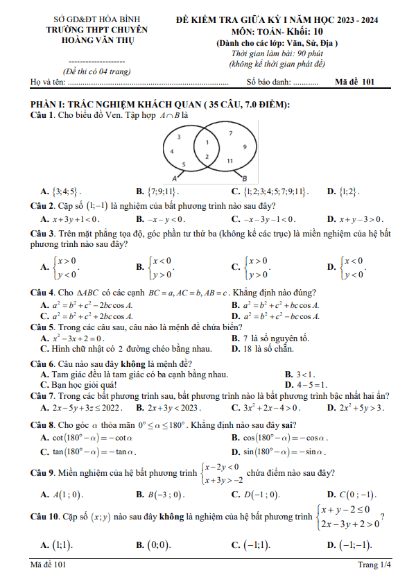 Đề thi giữa học kỳ 1 (HK1) môn Toán lớp 10 năm 2023 – 2024 trường chuyên Hoàng Văn Thụ Hòa Bình đã được Sytu giới thiệu đến quý thầy cô và các em học sinh. Bài kiểm tra bao gồm nhiều câu hỏi phong phú và đa dạng, giúp học sinh tự kiểm tra kiến thức của mình trong môn Toán.Ví dụ, trong đề thi có những câu hỏi như: “Câu nào sau đây không là mệnh đề?”, “Mệnh đề phủ định của mệnh đề ‘2018 là số tự nhiên chẵn’ là gì?”. Đây là những câu hỏi cơ bản nhưng lại rất quan trọng để đánh giá khả năng hiểu và áp dụng kiến thức của học sinh.Bên cạnh đó, đề thi cũng chú trọng đến việc kiểm tra khả năng suy luận và giải quyết vấn đề của học sinh thông qua việc đưa ra các bài toán, bài tập tư duy logic.Để đạt điểm cao trong bài kiểm tra, học sinh cần phải rèn luyện kỹ năng giải bài tập, hiểu rõ các kiến thức căn bản và áp dụng chúng vào thực hành. Hy vọng rằng đề thi này sẽ giúp học sinh tự tin và thành công trong việc học tập môn Toán.