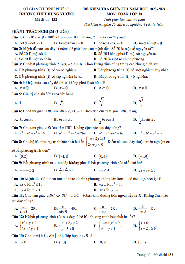 Đề thi giữa học kì 1 (HK1) môn Toán lớp 10 năm 2023 – 2024 trường THPT Hùng Vương Bình Phước đã được Sytu xin được giới thiệu đến quý thầy cô và các em học sinh. Đề thi bao gồm nhiều câu hỏi khác nhau, từ các mệnh đề đơn giản đến các bài toán phức tạp, giúp học sinh rèn luyện kỹ năng giải toán và logic.Một trong những câu hỏi đặc biệt trong đề thi là câu hỏi về mệnh đề phủ định của mệnh đề “Số 20 là một số nguyên tố”. Học sinh cần phải suy luận logic và xác định câu trả lời đúng trong số các phương án được đưa ra.Ngoài ra, đề thi cũng đưa ra một bài toán về sản xuất đồ gỗ mỹ nghệ, trong đó học sinh cần tính toán để tìm ra số lãi lớn nhất mà xưởng sản xuất có thể đạt được trong một ngày làm việc.Để học sinh có thể thử thách kiến thức và kỹ năng của mình, đề thi cũng đưa ra các bài toán về bất phương trình, yêu cầu học sinh phải áp dụng các kiến thức về đại số để giải quyết.Nội dung đề thi rõ ràng, cung cấp đáp án và hướng dẫn chấm điểm chi tiết, giúp học sinh tự đánh giá được khả năng và hiệu quả của quá trình học tập của mình. Đề thi giúp học sinh ôn tập và chuẩn bị tốt cho kỳ thi giữa học kì 1, từ đó nâng cao kỹ năng giải toán và củng cố kiến thức Toán của mình.
