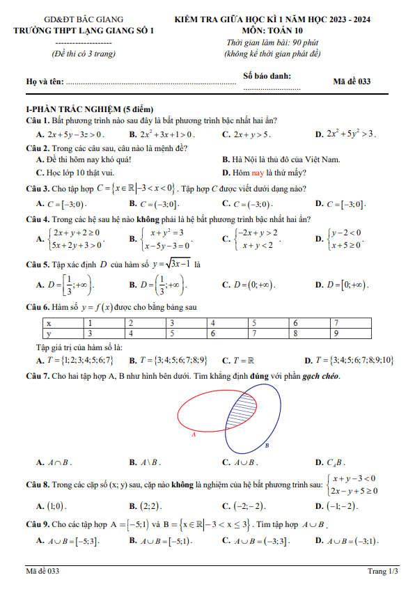 Đề thi giữa học kì 1 (HK1) lớp 10 môn Toán năm 2023 2024 trường THPT Lạng Giang 1 Bắc Giang