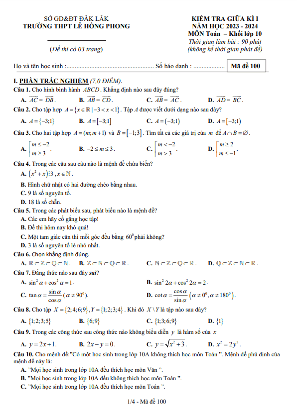 Đề thi giữa học kì 1 (HK1) lớp 10 môn Toán năm 2023 2024 trường THPT Lê Hồng Phong Đắk Lắk