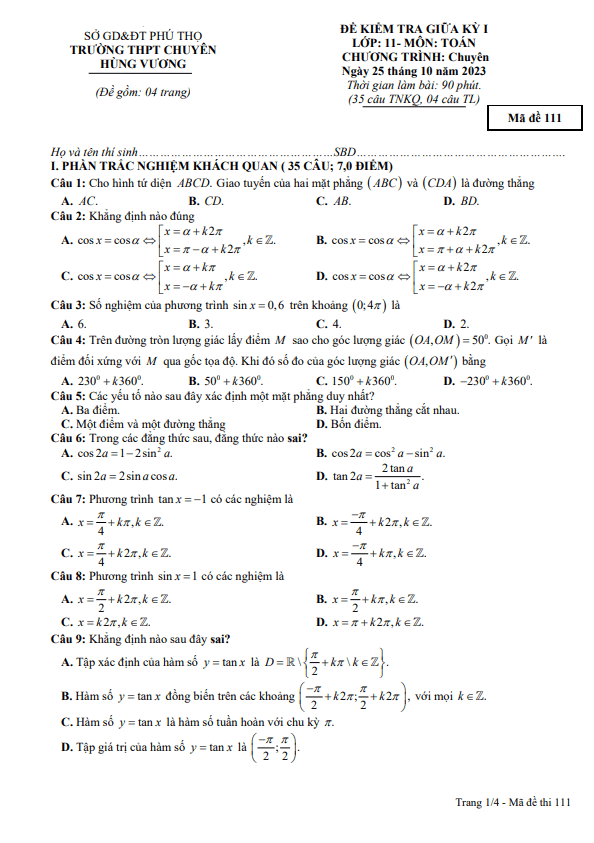 Trích dẫn một số câu hỏi từ Đề giữa kỳ 1 Toán lớp 11 chuyên năm 2023 – 2024 trường chuyên Hùng Vương – Phú Thọ: