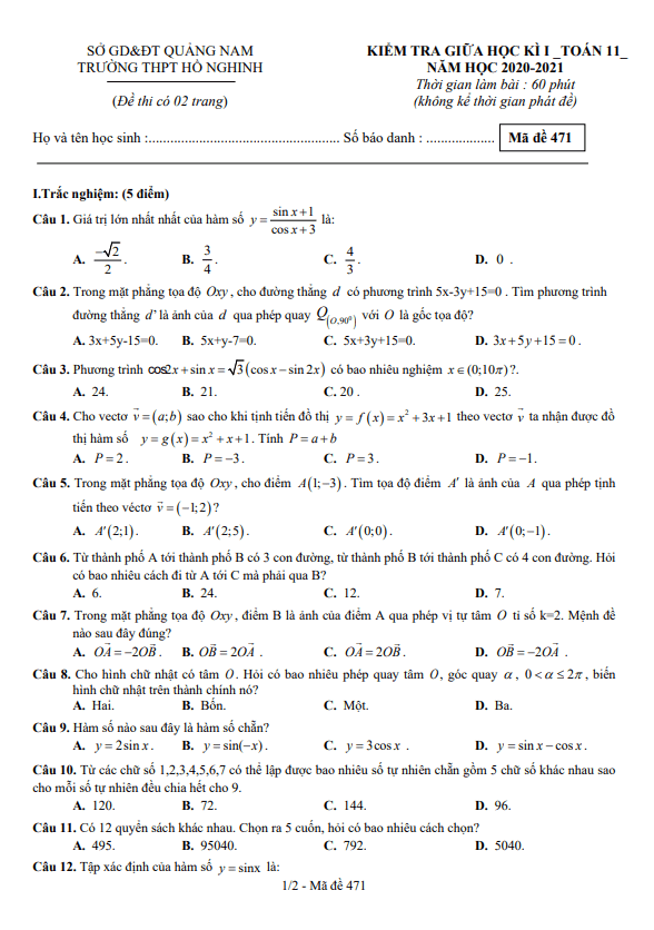Đề thi giữa học kì 1 (HK1) lớp 11 môn Toán năm 2020 2021 trường THPT Hồ Nghinh Quảng Nam