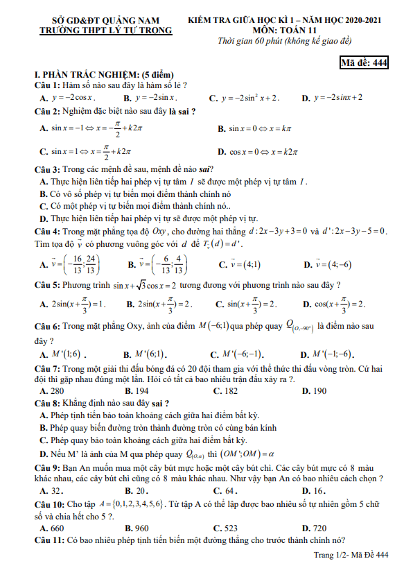 Xin chào quý thầy cô và các em học sinh khối 11! Hôm nay, Sytu xin giới thiệu đến mọi người đề thi giữa học kì 1 môn Toán lớp 11 năm học 2020 – 2021 tại trường THPT Lý Tự Trọng – Quảng Nam. Đề thi này được biên soạn theo dạng trắc nghiệm khách quan kết hợp với phần tự luận.