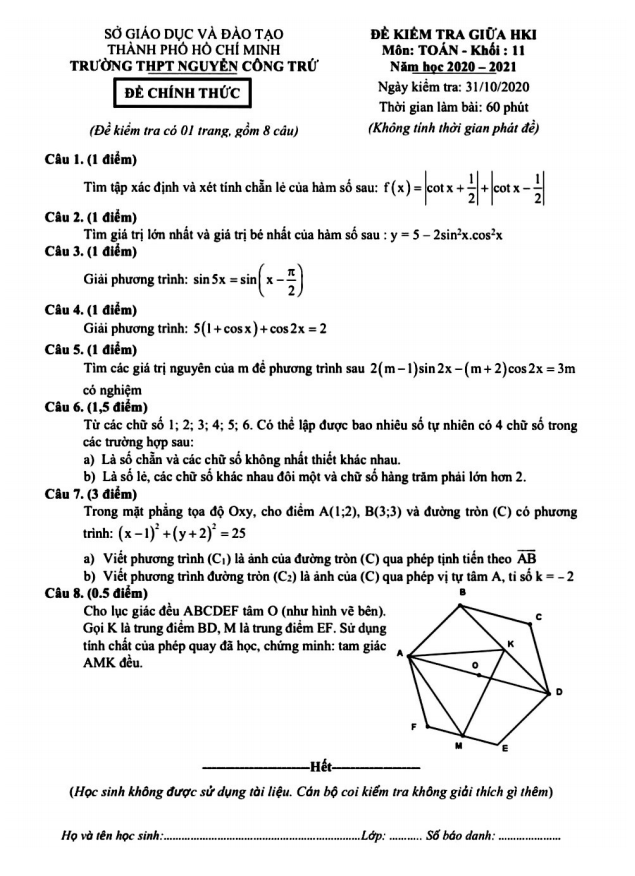 Ngày 31 tháng 10 năm 2020, học sinh lớp 11 tại trường THPT Nguyễn Công Trứ, TP Hồ Chí Minh đã tham gia kiểm tra khảo sát chất lượng môn Toán. Đề thi giữa học kì 1 năm học 2020 – 2021 bao gồm 8 bài toán dạng tự luận, được tổ chức trong thời gian 60 phút (không tính thời gian giám thị phát đề).