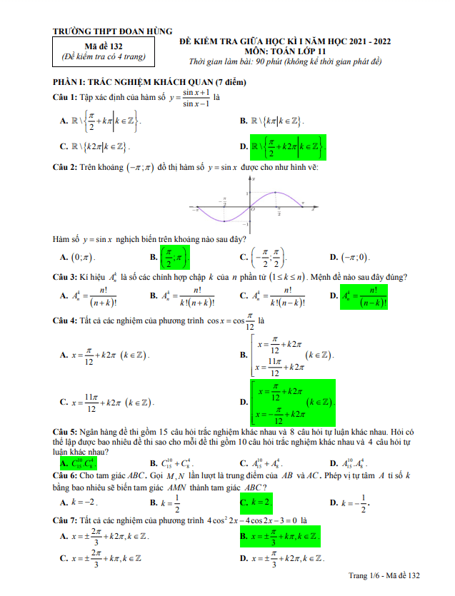 Đề thi giữa học kì 1 Toán lớp 11 trường THPT Đoan Hùng – Phú Thọ năm 2021 – 2022