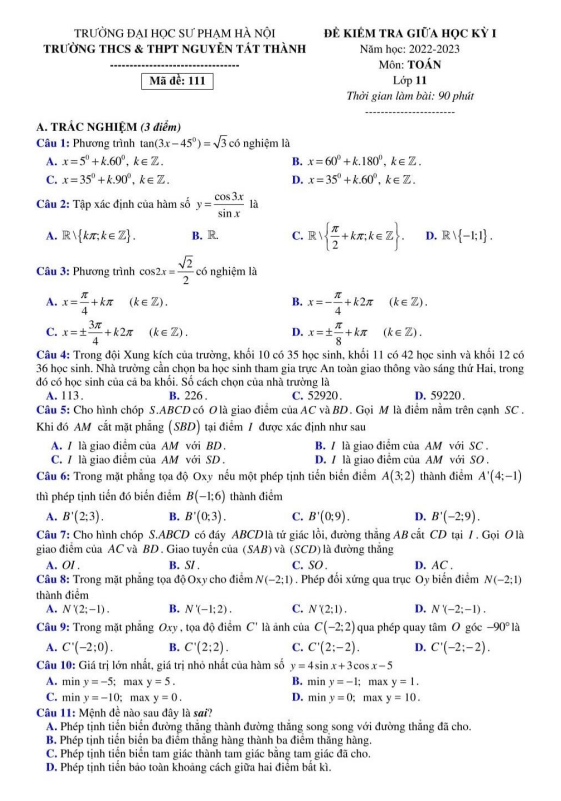 Chào quý thầy cô và các em học sinh! Hôm nay mình xin giới thiệu đến các bạn đề kiểm tra chất lượng giữa học kì 1 môn Toán lớp 11 năm học 2022 – 2023 của trường THCS và THPT Nguyễn Tất Thành, Đại học Sư phạm Hà Nội, thành phố Hà Nội. Đề thi có mã đề 111 được biên soạn theo hình thức trắc nghiệm khách quan kết hợp với tự luận, với tỉ lệ điểm là 30% trắc nghiệm và 70% tự luận. Thời gian làm bài là 90 phút (không kể thời gian phát đề).