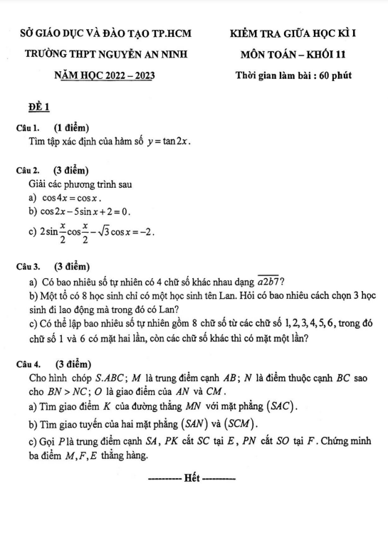 Đề thi giữa học kì 1 lớp 11 Toán năm 2022 2023 trường THPT Nguyễn An Ninh TP HCM