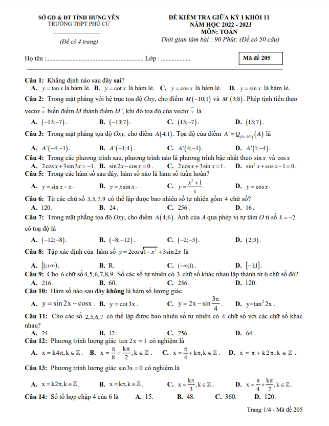 Đề kiểm tra giữa học kỳ 1 môn Toán lớp 11 năm 2022 – 2023 trường THPT Phù Cừ Hưng Yên