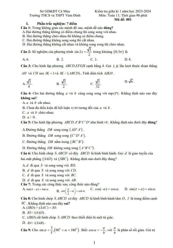 Chào quý thầy cô giáo và các em học sinh lớp 11! Dưới đây là đề kiểm tra giữa học kì 1 môn Toán của năm học 2023 – 2024 tại trường THCS&THPT Vàm Đình, tỉnh Cà Mau. Đề thi bao gồm câu hỏi trắc nghiệm và hướng dẫn chấm điểm cho phần tự luận, mã đề 001 – 002.