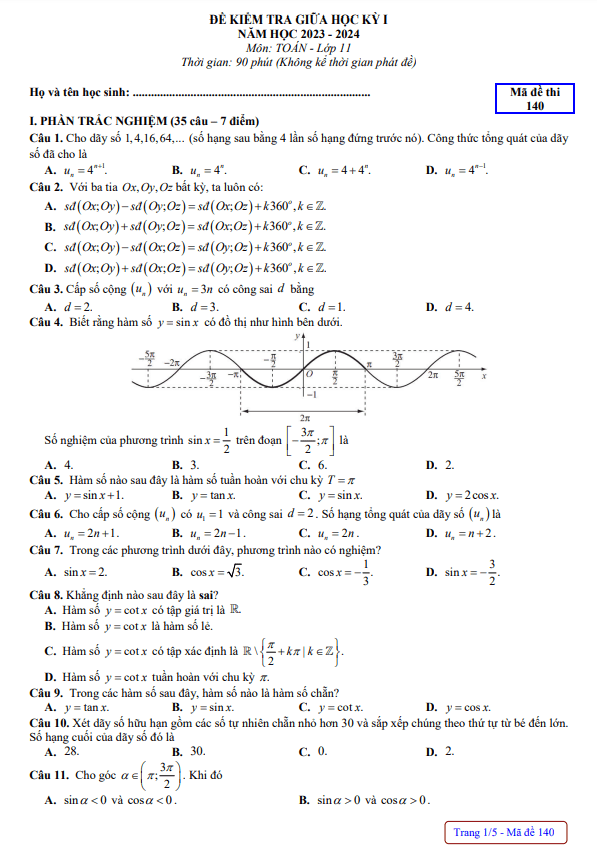 Xin chào quý thầy cô giáo và các em học sinh lớp 11! Hôm nay, chúng ta sẽ cùng tìm hiểu về đề kiểm tra giữa học kỳ 1 môn Toán lớp 11 năm học 2023 – 2024 tại trường THPT chuyên Quốc học Huế, tỉnh Thừa Thiên Huế. Đề thi có mã đề 140, bao gồm 70% câu hỏi trắc nghiệm (35 câu) và 30% câu hỏi tự luận (4 câu), thời gian làm bài là 90 phút.