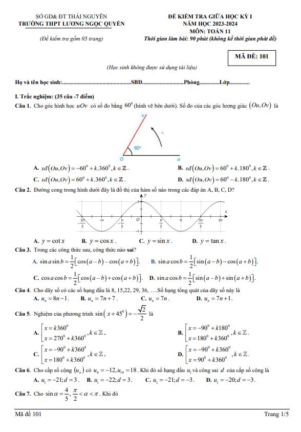 Đề thi giữa học kì 1 (HK1) lớp 11 môn Toán năm 2023 2024 trường THPT Lương Ngọc Quyến Thái Nguyên