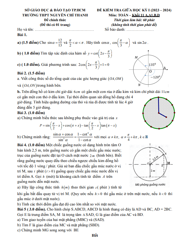 Đề thi giữa học kì 1 (HK1) lớp 11 môn Toán năm 2023 2024 trường THPT Nguyễn Chí Thanh TP HCM