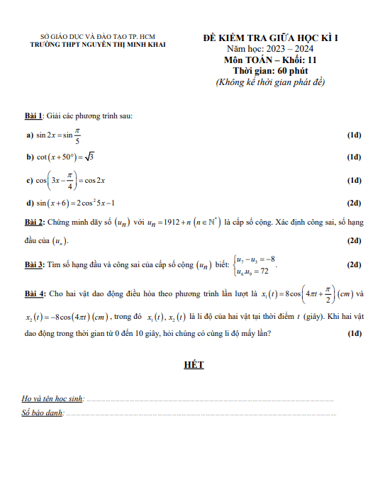 Đề thi giữa học kì 1 (HK1) lớp 11 môn Toán năm 2023 2024 trường THPT Nguyễn Thị Minh Khai TP HCM
